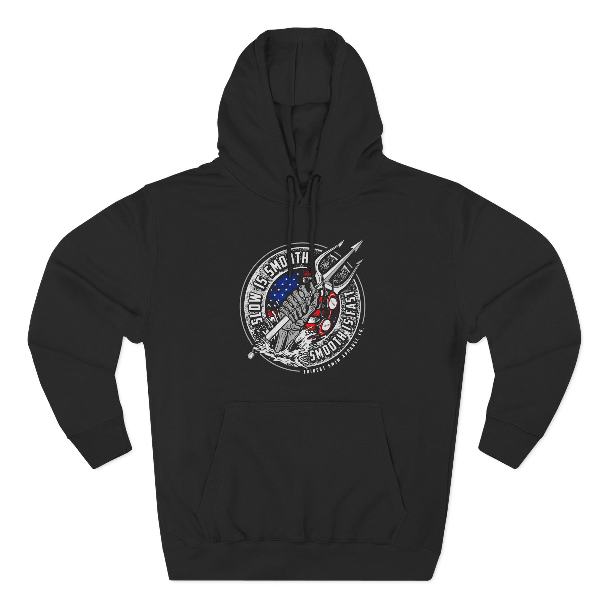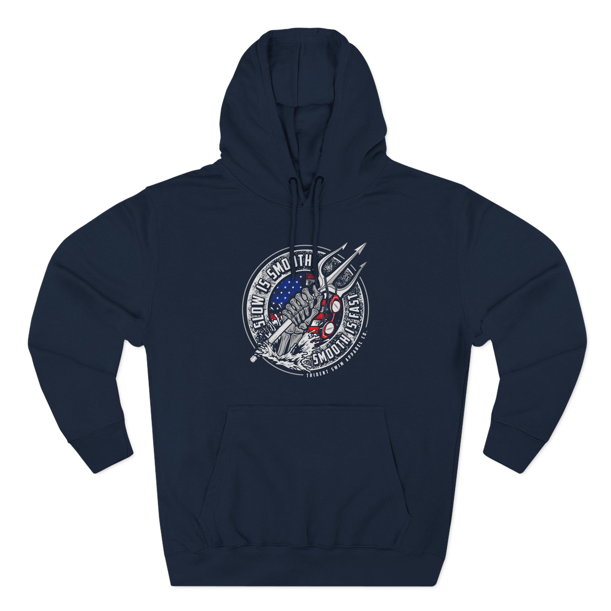 Discipline. Precision. Victory. Slow is Smooth. Smooth is Fast. This special operations motto transcends military application and applies to swimming and every day life. With patriotic accents and battle-worn style, this design represents the truth every swimmer and warrior knows: control builds efficiency, and efficiency builds speed.